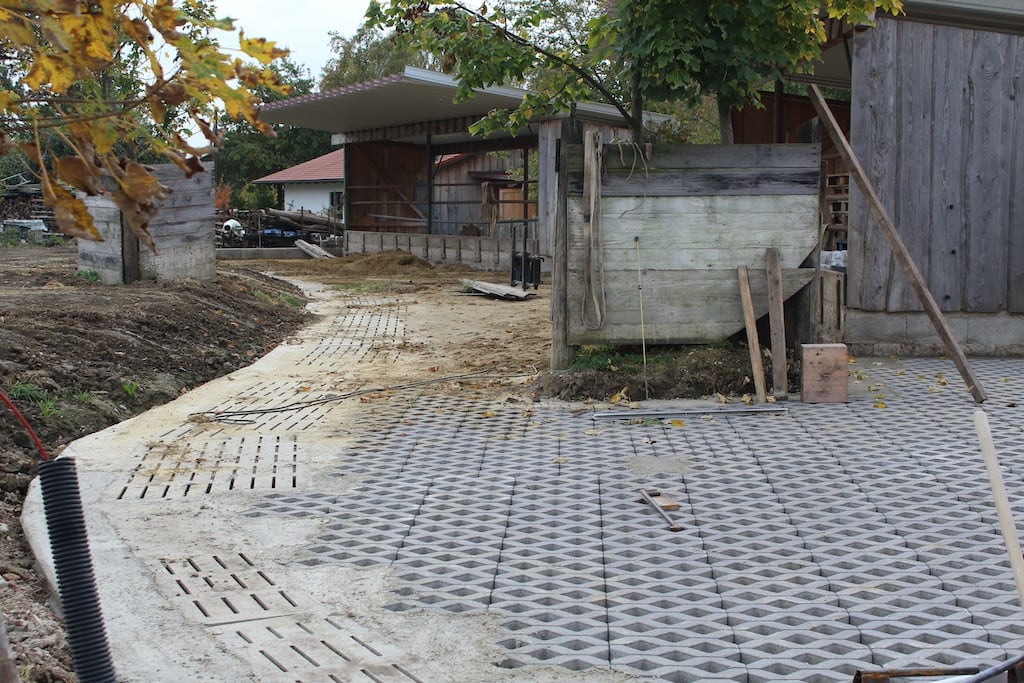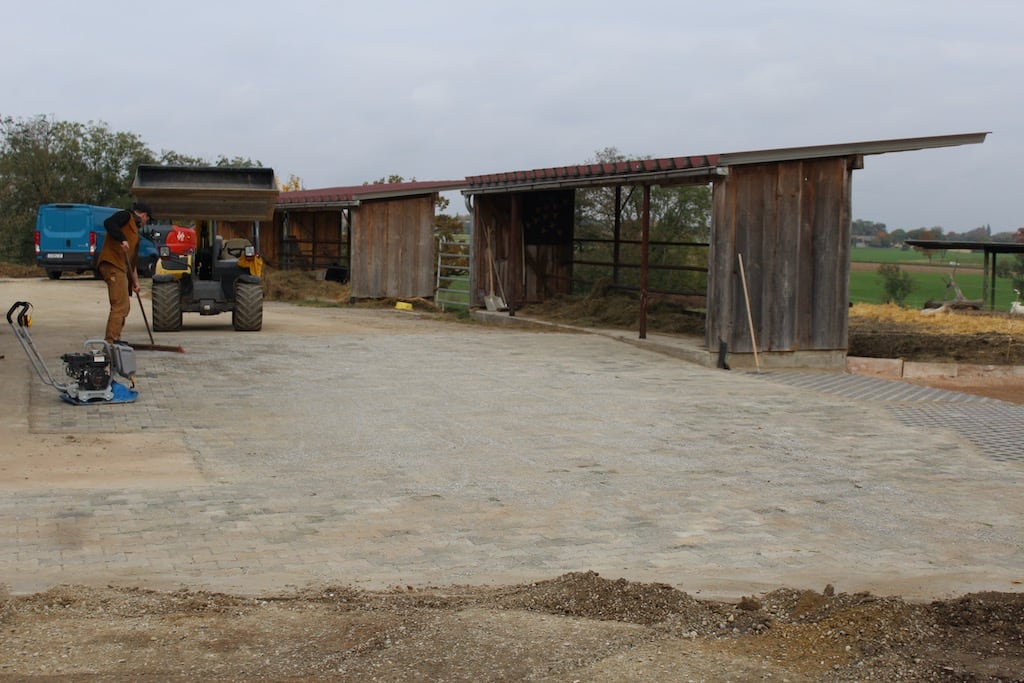Rund um den Hof türmen sich Paletten mit Rasengittersteinen, die zur Befestigung der Laufhöfe bei den Yaks verbaut werden sollen. Ein Teil ist schon geschafft, der letzte Teil allerdings wird auf nächsten Sommer verschoben.